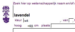 Als je niet weet in welk veld je moet zoeken, zoek dan in het veld dat boven zoekopdracht uitvoeren' staat. Hiermee zoek je in alle tekstvelden behalve de beschrijving. Je kunt hiermee dus zowel op Nederlandse als op wtenschappelijke naam of cultivar zoeken.